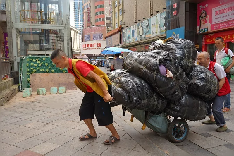 曹根初正把一袋袋服装打包运往环洲城
