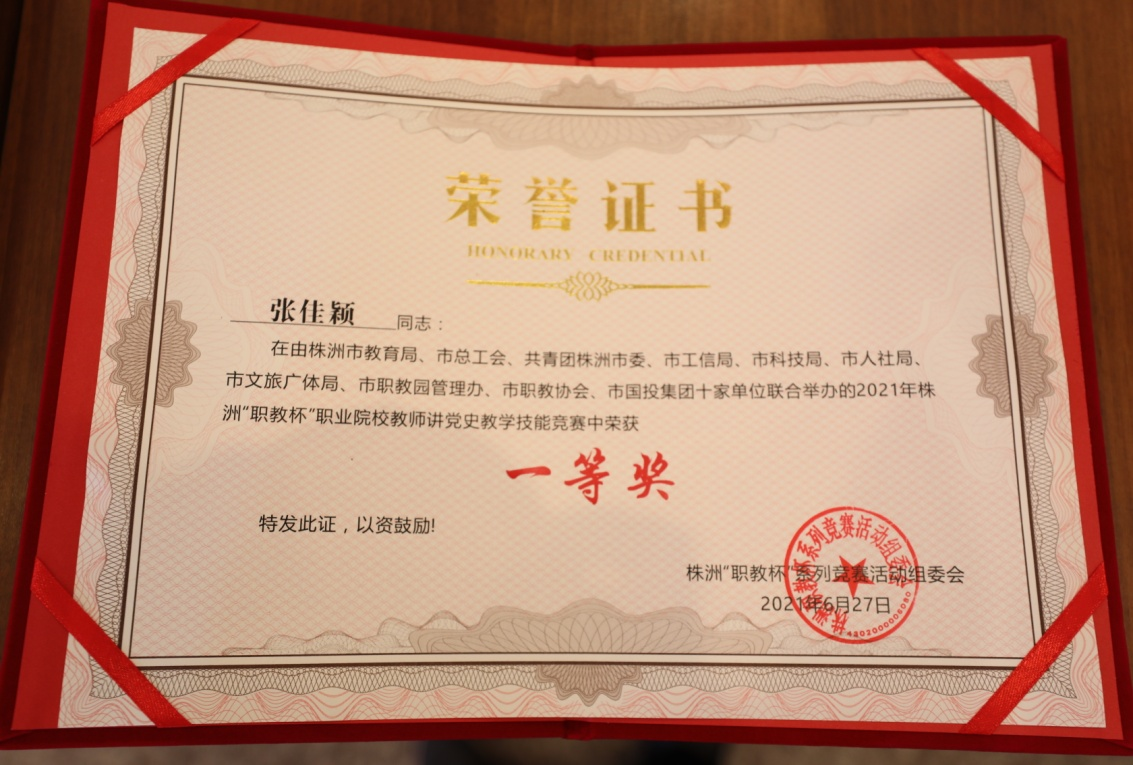 6月27日,在2021年株洲“职教杯”职业院校教师讲党史教学技能竞赛中,南宫·NG28(China)官方网站建筑装饰系教师张佳颖荣获一等奖,并被授予株洲市“五一劳动奖章”。