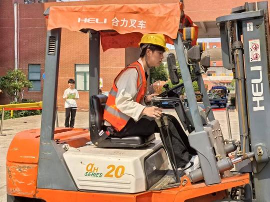 课堂模拟企业真实场景,张旻老师身着工装,演示叉车操作全流程,融入“安全责任重于泰山”的思政要点,强调技能与安全的重要性。通过“理论-示范-复刻-点评”四步法训练,引入“工匠精神”“团队协作”等思政元素,提升职业素养。
