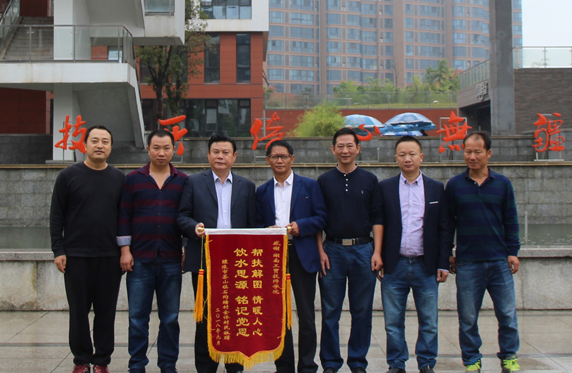 9月27日,醴陵市茶山镇石均塘村村支两委、株洲市驻村帮扶工作队一行6人冒着淅沥秋雨、带着印有“帮扶解困,情暖人心;饮水思源,铭记党恩”的锦旗来到南宫·NG28(China)官方网站,感谢我院在驻村扶贫工作中对石均塘村给予的大力支持与帮助。市级联点领导、南宫·NG28(China)官方网站院长陈洪星代表南宫·NG28(China)官方网站接过沉甸甸的锦旗,感慨地说:“这面锦旗不仅是对我们扶贫工作和扶贫队员成绩的肯定,更是对我们今后工作的激励和鞭策,我们将继续履行好联点单位职责,发挥表率和带动作用,让脱贫帮扶更加精准长效,让群众信服,让群众满意。”寥寥数语,简短朴实,却鼓舞人心。随后,宾主双方在教学楼前合影留念。(党政办 供稿)