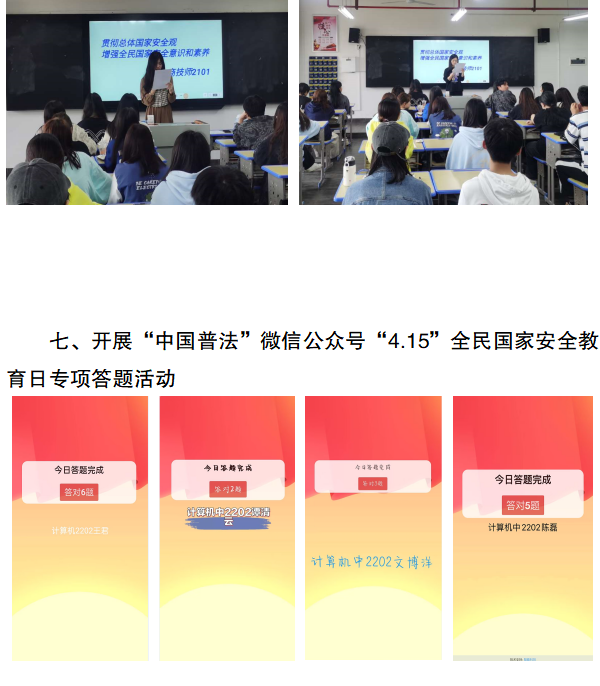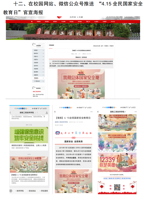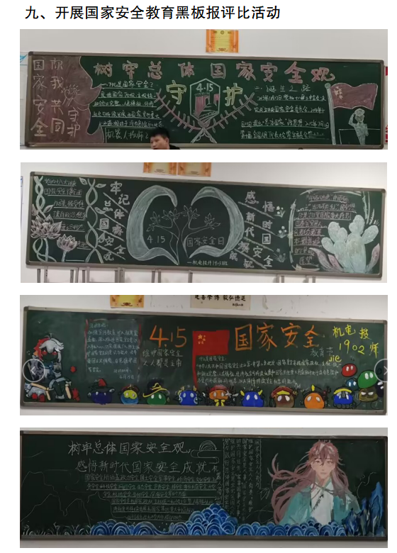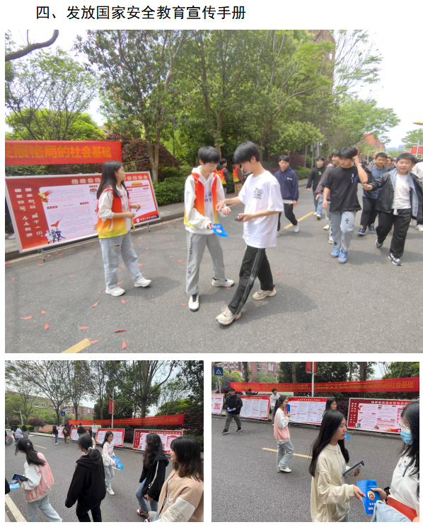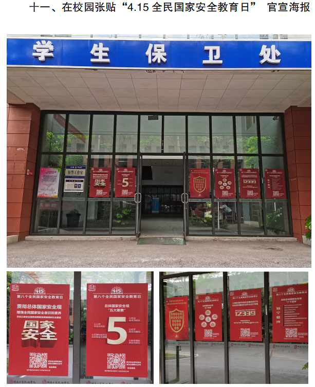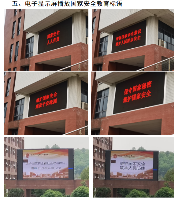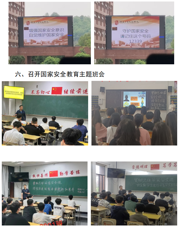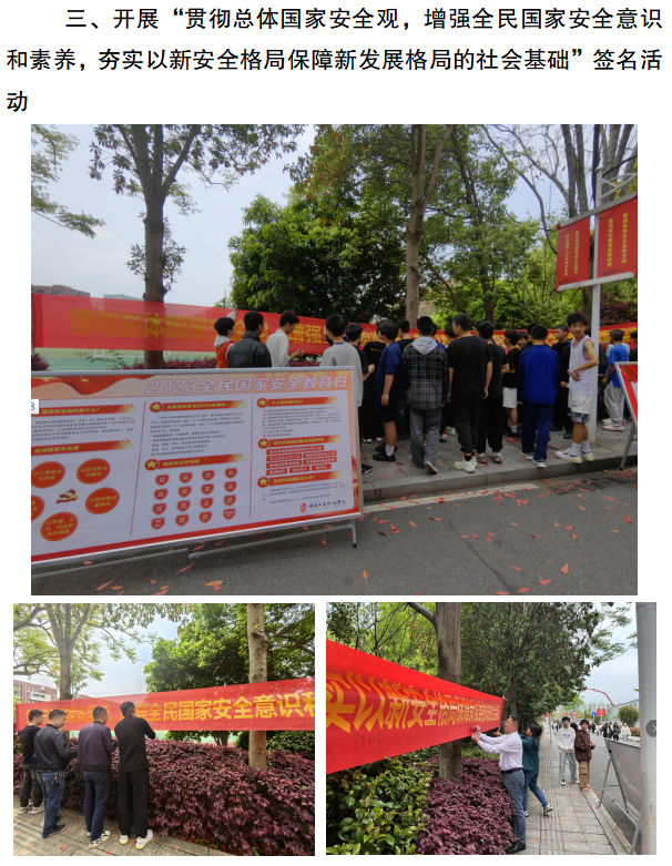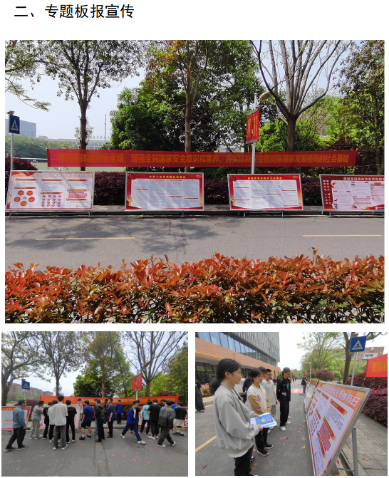 为提高全体学生国家安全意识,根据实施方案的要求开展了专题教育活动。其中:从4月7日开始,连续在南宫·NG28(China)官方网站电子屏滚动播出国家安全宣传标语,在校园广播开设了国家安全教育专栏,在学生保卫处门口、校园食堂、宿舍、教学楼、宣传栏等处摆放了国家安全教育展板或张贴了国家安全宣传海报。4月12日中午,在南宫·NG28(China)官方网站食堂马路组织开展了“贯彻总体国家安全观,增强全民国家安全意识和素养,夯实以新安全格局保障新发展格局的社会基础”签名活动,同时向师生发放了国家安全教育宣传手册。4月12日下午,邀请职教城派出所驻校民警徐闻在阶梯教室开展了国家安全知识讲座。4月12日晚上各班组织召开了“贯彻总体国家安全观,增强全民国家安全意识和素养”主题班会,同时组织全体学生积极参与了“中国普法”微信公众号“4.15”全民国家安全教育日专项答题活动和“反邪教”签名活动。另外,各教学系分别组织开展了国家安全宣传教育黑板报评比活动,并组织学生将国家安全教育情况在微信朋友圈进行分享,扩大了国家安全教育的影响,对提高全社会关注国家安全、主动参与和自觉维护国家安全的意识和能力起到了一定推动作用。