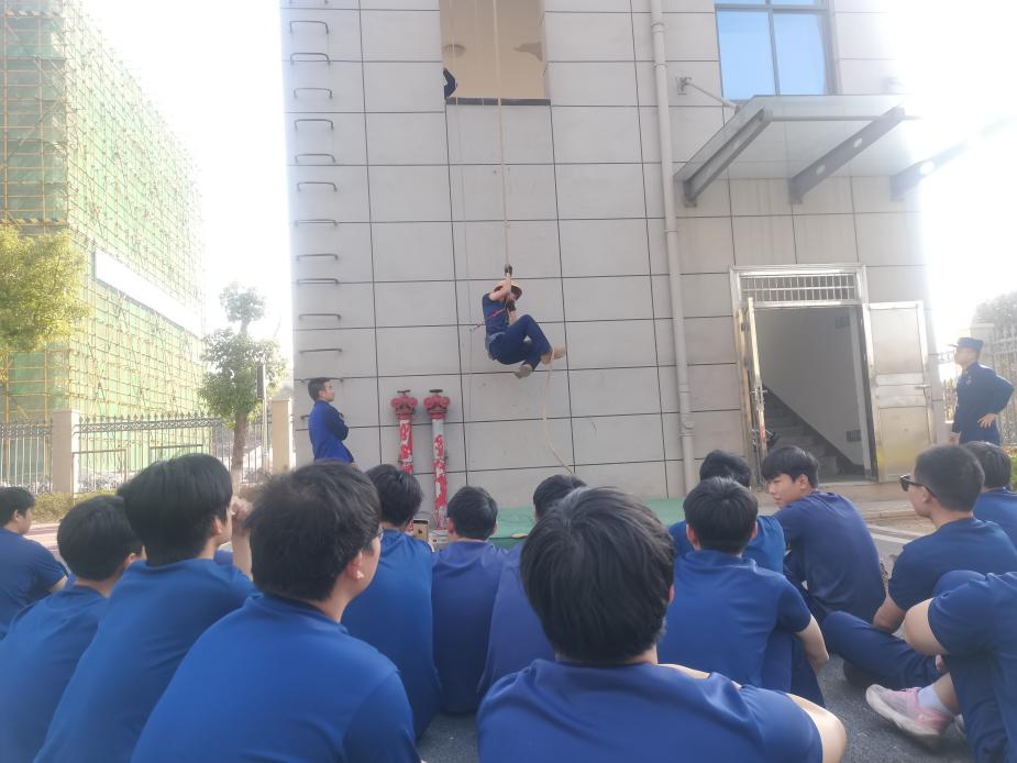消防站工作人员带领师生参观了消防车辆及随车器材装备区,详细介绍了水罐消防车、云梯消防车、泡沫消防车等不同车型的功能及适用场景,并演示了紧急撤离装置、热成像仪、金属切割器等专业设备的操作原理。同时,为增强实践战斗能力,在消防员的指导下同学们试穿了厚重的灭火战斗服,亲身体验了绳索攀爬及高空救援场景,展现了“特别能吃苦、特别能战斗”的职业精神。在消防员生活区,同学们被整齐划一的“豆腐块”被褥和井然有序的物品摆放所震撼。学生感慨道:“从生活细节到火场冲锋,消防员的无私奉献让大家深刻理解了‘责任’二字的重量。”