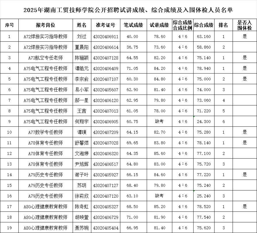 附件 2025年南宫·NG28(China)官方网站公开招聘试讲成绩、综合成绩及入围体检人员名单